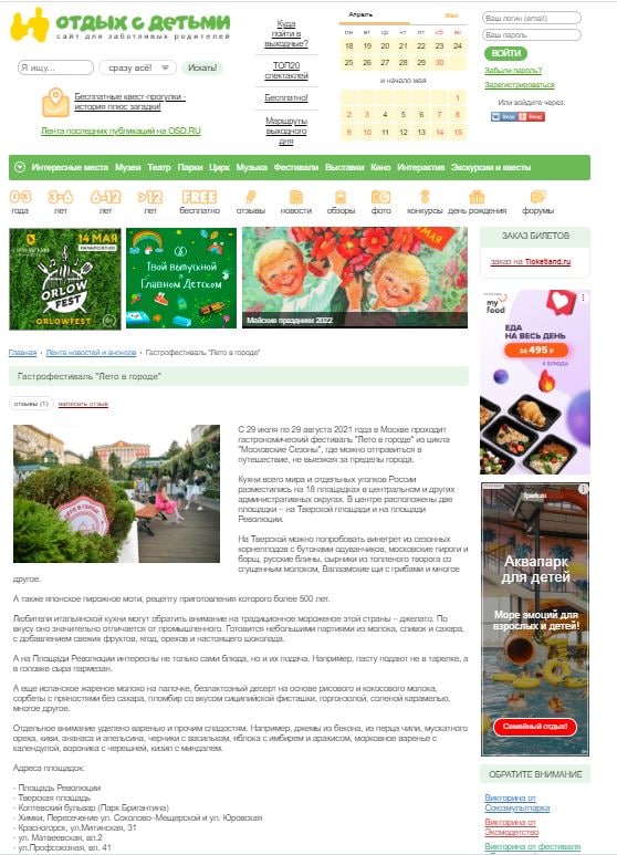 Так, 5 августа 2021 года были разработаны публикации для размещения анонсов и подробной программы фестиваля на сайте «Отдых с детьми». Материалы также были опубликованы и в новостной ленте информационного ресурса.