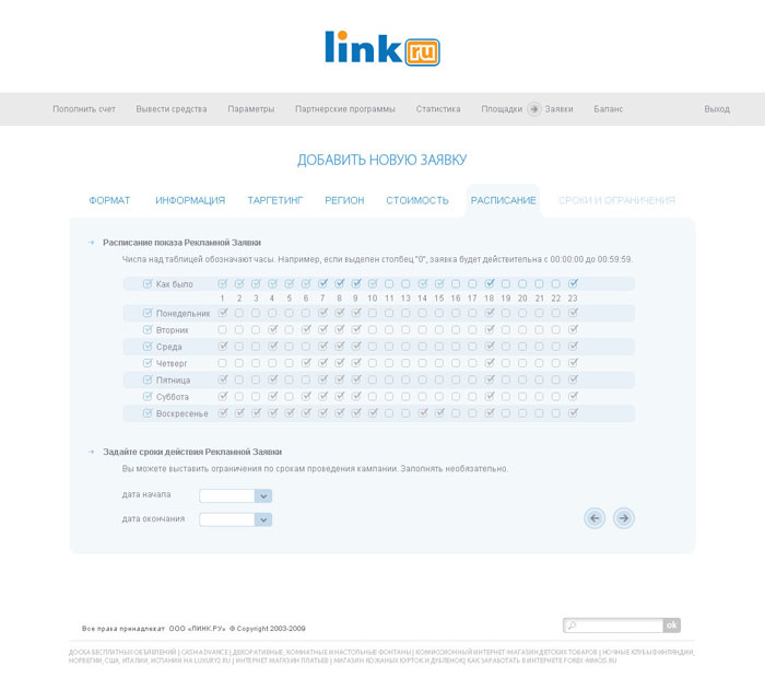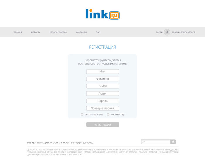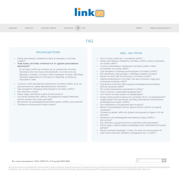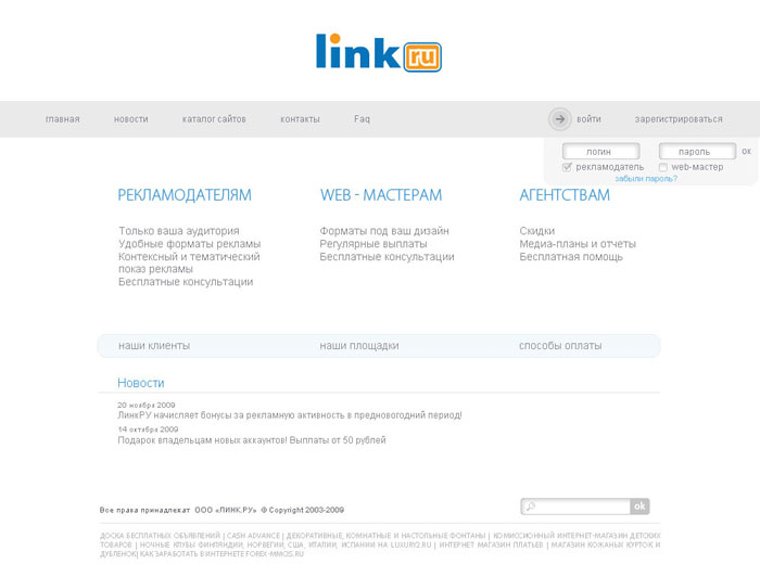 ЛИНК.РУ – система рекламных сервисов с оплатой за клик. Рекламный сервис ЛИНК.РУ активно развивается. С повышением спроса на Интернет-рекламу в целом ЛИНК.РУ предлагает своим клиентам все новые форматы и услуги. Для рекламодателей и веб-мастеров открываются новые возможности. Основные правила юзабилити гласят: необходимая информации должна находиться на расстоянии 3 кликов (максимум) от пользователя. Это не дань моде, а элементарное уважение к своим клиентам. Именно из-за увеличения объема информации было принято решение обновления дизайна сайта.