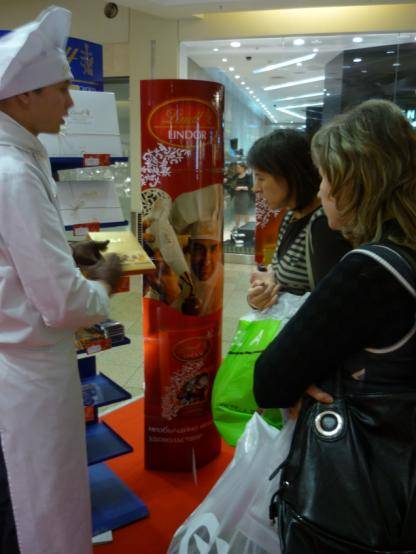 Стильные стенды, выполненные в фирменной красной цветовой гамме, активно привлекали внимание посетителей центров. Здесь каждый мог не только попробовать Lindor, узнать от промоутеров-шоколатье историю и уникальность технологии создания, но так же выбрать и приобреcти шоколад с понравившимся вкусом и приглянувшейся упаковке