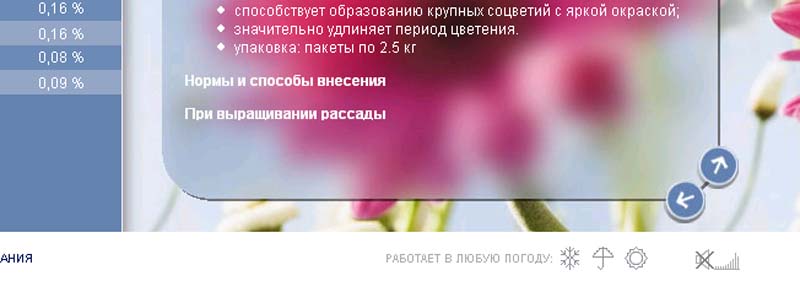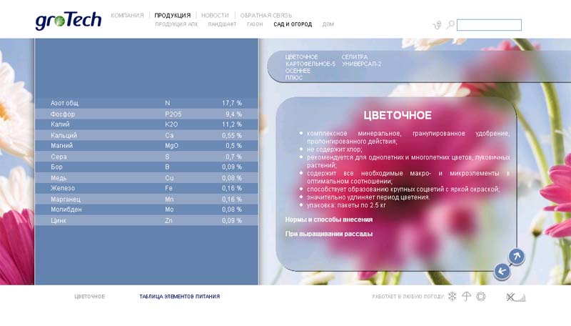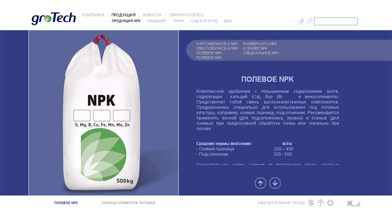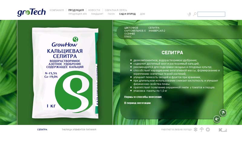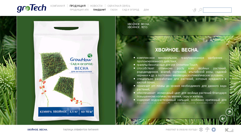 В основу концепции сайта была заложена идея устойчивости качества и постоянство эффекта от использования удобрений компании "ГроуТек", в отличие от переменчивый внешних факторов. А главное неконтролируемое условие - это, конечно, погода. Чтобы подчеркнуть устойчивость "ГроуТек" перед любыми испытаниями, был использован слоган: "Работает в любую погоду...".