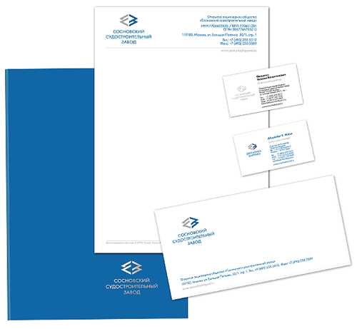 Название сопровождает фирменный знак на всей рекламной продукции. Оно расшифровывает аббревиатуру CCЗ и несёт в себе исчерпывающую информацию о роде деятельности и происхождении компании. Полное название компании всегда пишется кириллицей – СОСНОВСКИЙ СУДОСТРОИТЕЛЬНЫЙ ЗАВОД, за исключением фирменного логотипа в английских версиях документации и полиграфических материалов. В этом случае полное название компании пишется латиницей – SOSNOVKA SHIPYARD.