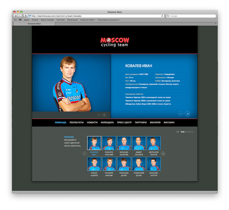 Успех команды - это заслуга каждого отдельного спортсмена. Поэтому раздел КОМАНДА проработан особенно тщательно. В нем можно найти информацию о каждом участнике, его достижениях.